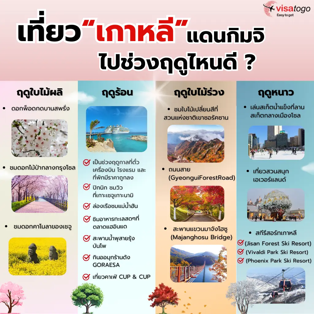 ก่อนจะเริ่มวางแผนเดินทางไปเที่ยวเกาหลีใต้ Visatogo เราได้รวบรวมสถานที่ท่องเที่ยวและฤดูกาลของเกาหลีตรงกับเดือนไหน มีอุณหภูมิอยู่ที่เท่าไหร่ สภาพอากาศแบบไหน เพื่อเตรียมความพร้อมของร่างกาย รวมถึงเสื้อผ้าเครื่องแต่งการ เพื่อให้คุณวางแผนเดินทางไปเก็บเกี่ยวความสวยงามของแดนกิมจิได้อย่างมีความสุข