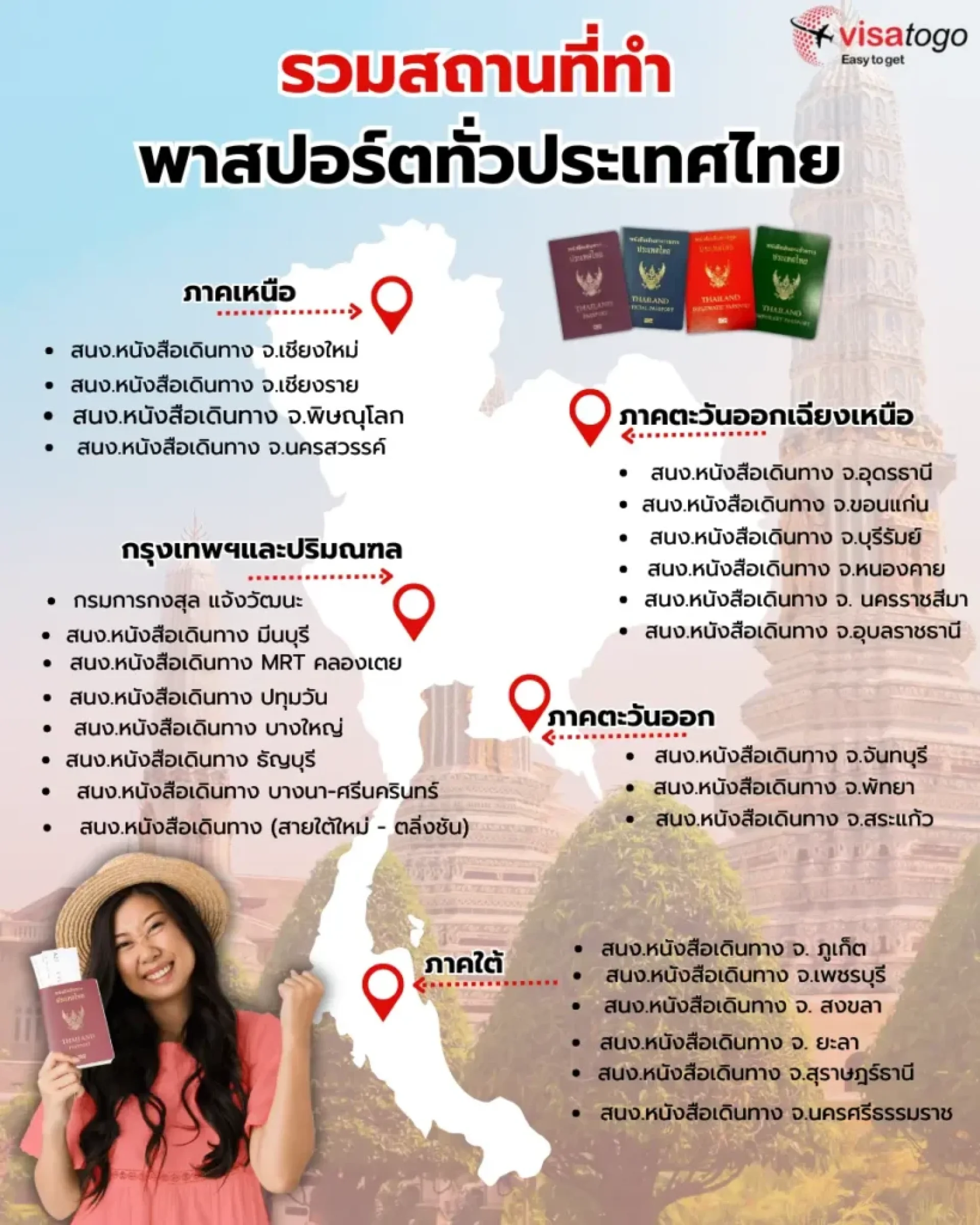พาสปอร์ตเป็นเอกสารสำคัญสำหรับการเดินทางไปต่างประเทศ หลายคนอาจกังวลกับขั้นตอนและเอกสารที่ยุ่งยาก แต่ปัจจุบัน กรมการกงสุล กระทรวงการต่างประเทศ ได้พัฒนาระบบให้บริการที่สะดวก รวดเร็ว ทันใจ วันนี้ Visatogo ได้รวมรวบสถานที่ทำพาสปอร์ตทั่วประเทศไทยมาให้แล้ว สามารถค้นหาสถานที่ใกล้บ้านของคุณได้ คลิกเลย จะมีที่ไหนบ้าง มาดูเลย